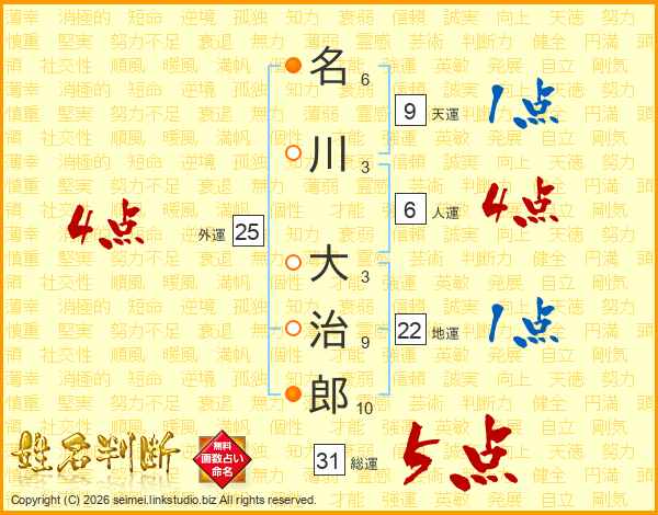 名川大治郎さんの総運は31画の5点!