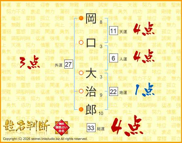 岡(8画)口(3画) 大(3画)治(9画)郎(10画)