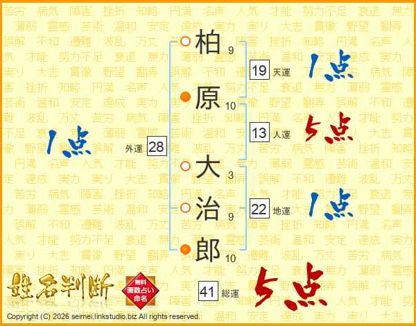 柏(9画)原(10画) 大(3画)治(9画)郎(10画)