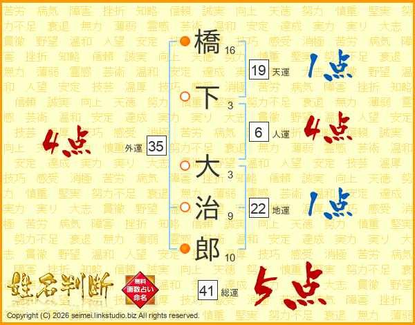 橋(16画)下(3画) 大(3画)治(9画)郎(10画)