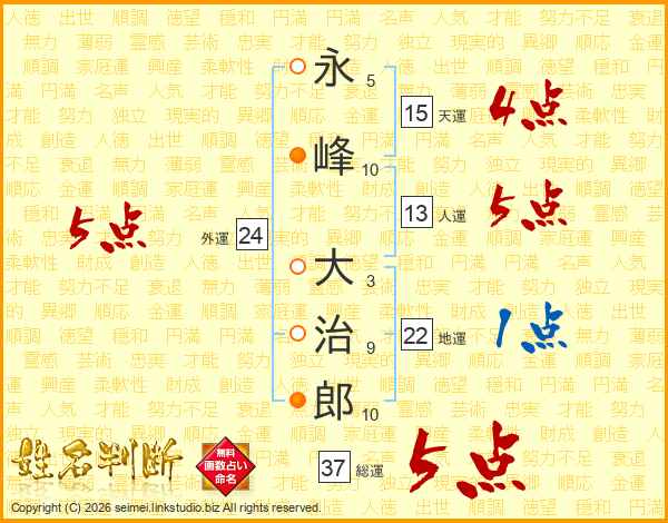 永(5画)峰(10画) 大(3画)治(9画)郎(10画)