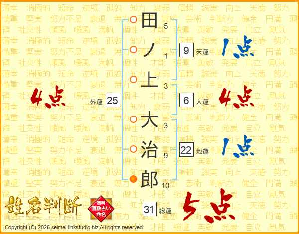 田(5画)ノ(1画)上(3画) 大(3画)治(9画)郎(10画)