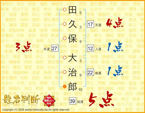 田(5画)久(3画)保(9画) 大(3画)治(9画)郎(10画)