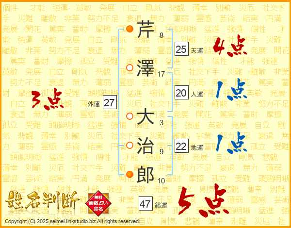 芹(8画)澤(17画) 大(3画)治(9画)郎(10画)