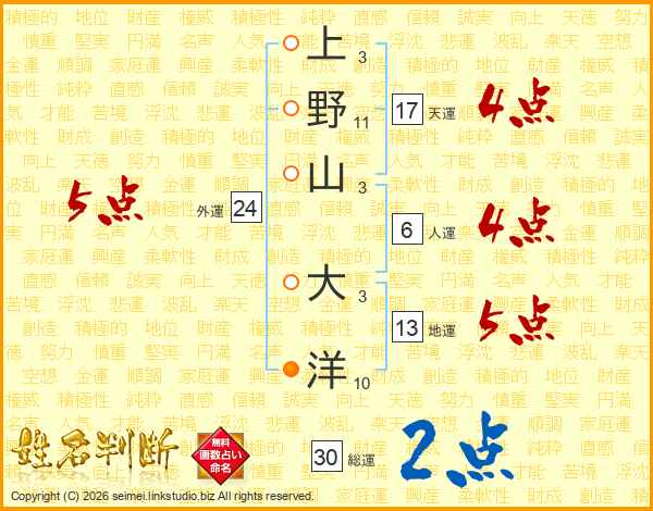 上(3画)野(11画)山(3画) 大(3画)洋(10画)