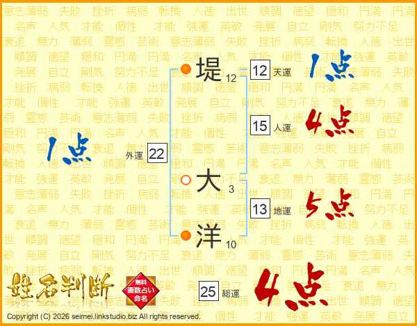 生活面を象徴する運勢です。外部から受ける影響力を表し、結婚運、家庭運や職場、環境への順応性を表します。総運から人運を引いた画数。姓や名が1文字の場合を除く。