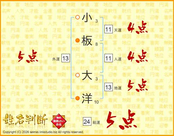 あなたの人生を表す1番重要な運勢です。生涯を通じて影響する総合運となり、主に50歳以降の晩年期に影響を及ぼします。苗字と名前の合計画数。