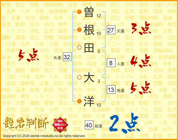 曽(12画)根(10画)田(5画) 大(3画)洋(10画)