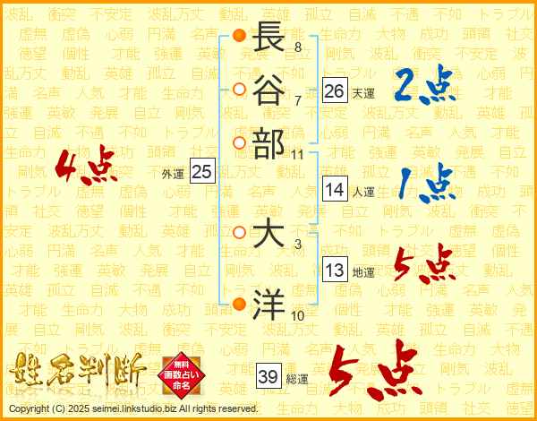 長(8画)谷(7画)部(11画) 大(3画)洋(10画)