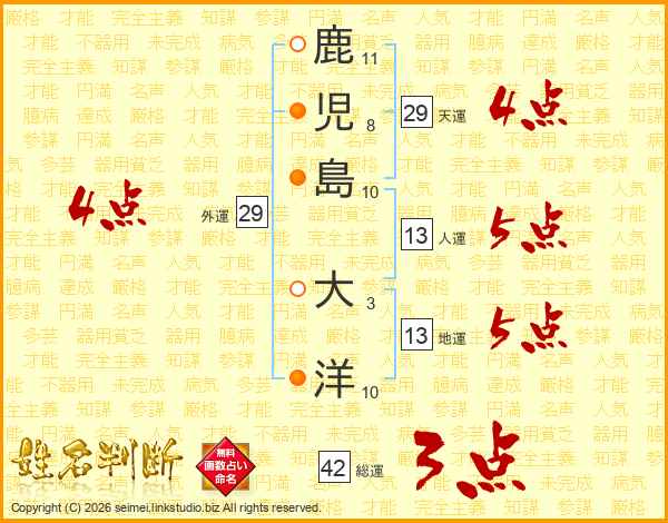 鹿(11画)児(8画)島(10画) 大(3画)洋(10画)