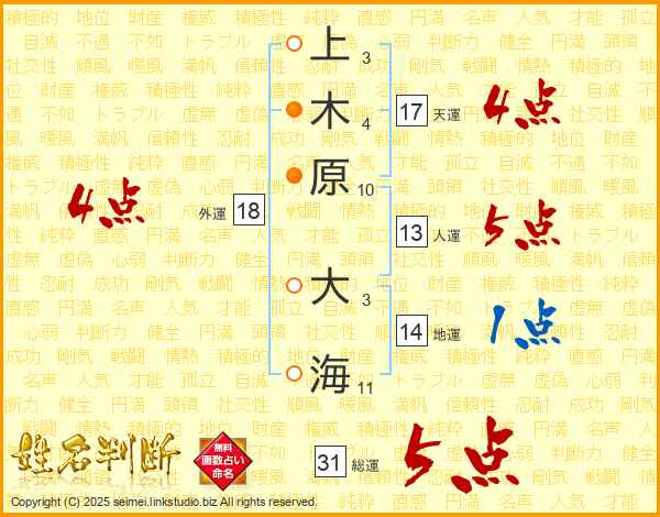 生活面を象徴する運勢です。外部から受ける影響力を表し、結婚運、家庭運や職場、環境への順応性を表します。総運から人運を引いた画数。姓や名が1文字の場合を除く。