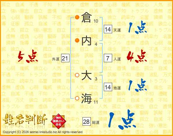 倉内大海さんの総運は28画の1点!