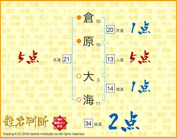 倉原大海さんの人運は13画の5点!