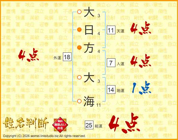 生活面を象徴する運勢です。外部から受ける影響力を表し、結婚運、家庭運や職場、環境への順応性を表します。総運から人運を引いた画数。姓や名が1文字の場合を除く。