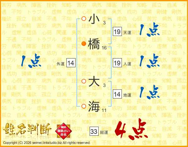 生活面を象徴する運勢です。外部から受ける影響力を表し、結婚運、家庭運や職場、環境への順応性を表します。総運から人運を引いた画数。姓や名が1文字の場合を除く。