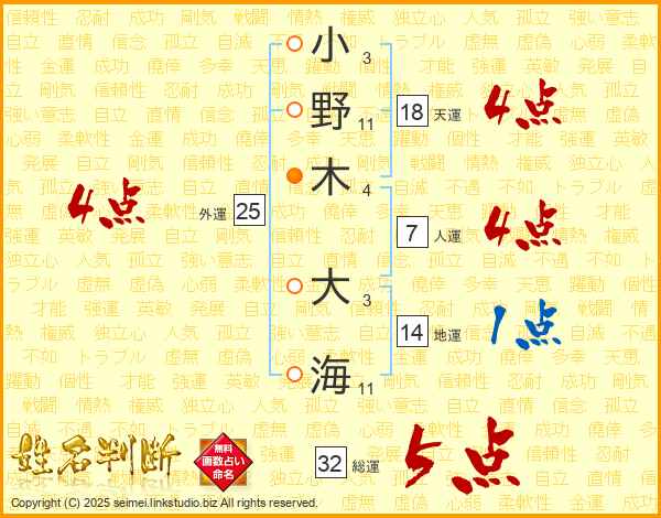 生活面を象徴する運勢です。外部から受ける影響力を表し、結婚運、家庭運や職場、環境への順応性を表します。総運から人運を引いた画数。姓や名が1文字の場合を除く。
