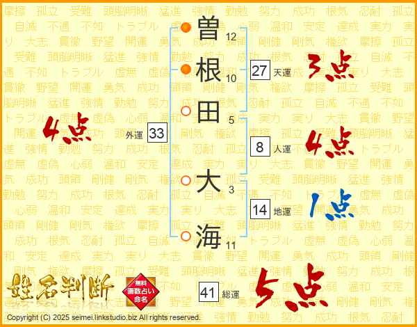 曽(12画)根(10画)田(5画) 大(3画)海(11画)