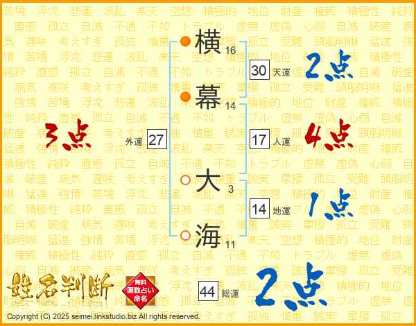 生活面を象徴する運勢です。外部から受ける影響力を表し、結婚運、家庭運や職場、環境への順応性を表します。総運から人運を引いた画数。姓や名が1文字の場合を除く。