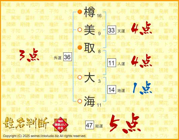 樽(16画)美(9画)取(8画) 大(3画)海(11画)
