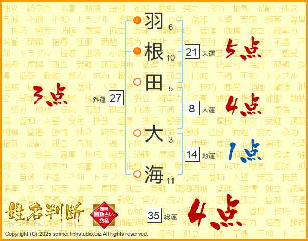 羽根田大海さんの天運は21画の5点!