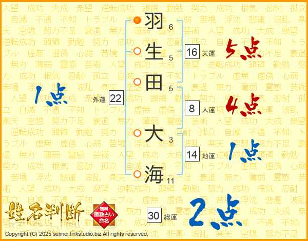 羽(6画)生(5画)田(5画) 大(3画)海(11画)