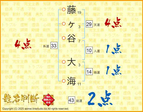 藤(19画)ヶ(3画)谷(7画) 大(3画)海(11画)