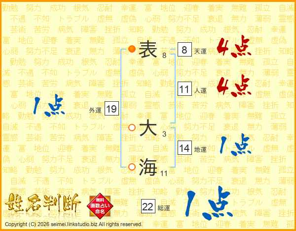 あなたの人生を表す1番重要な運勢です。生涯を通じて影響する総合運となり、主に50歳以降の晩年期に影響を及ぼします。苗字と名前の合計画数。