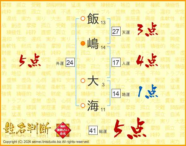 飯(13画)嶋(14画) 大(3画)海(11画)