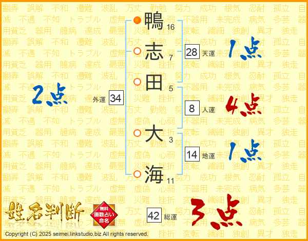 鴨(16画)志(7画)田(5画) 大(3画)海(11画)