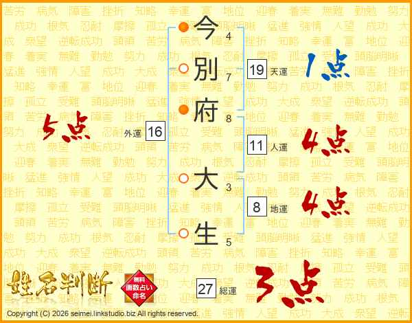 今(4画)別(7画)府(8画) 大(3画)生(5画)