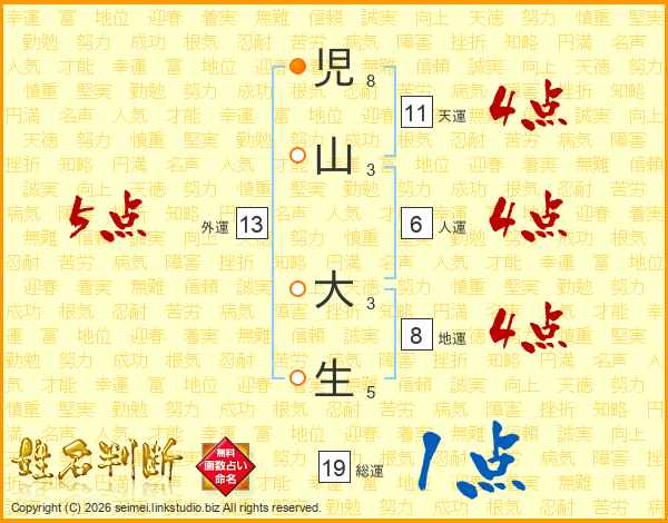 生活面を象徴する運勢です。外部から受ける影響力を表し、結婚運、家庭運や職場、環境への順応性を表します。総運から人運を引いた画数。姓や名が1文字の場合を除く。
