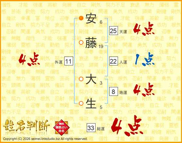 安(6画)藤(19画) 大(3画)生(5画)