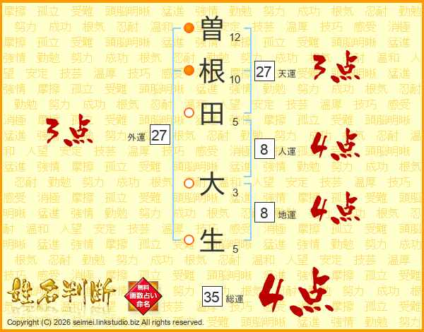 曽(12画)根(10画)田(5画) 大(3画)生(5画)