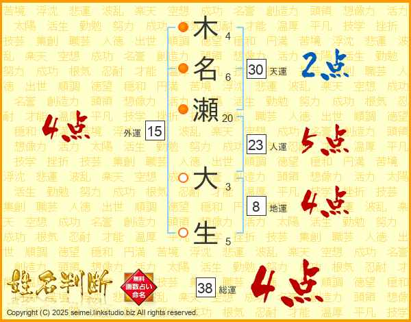 木(4画)名(6画)瀬(20画) 大(3画)生(5画)