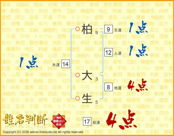 生活面を象徴する運勢です。外部から受ける影響力を表し、結婚運、家庭運や職場、環境への順応性を表します。総運から人運を引いた画数。姓や名が1文字の場合を除く。