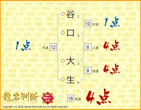 あなたの人生を表す1番重要な運勢です。生涯を通じて影響する総合運となり、主に50歳以降の晩年期に影響を及ぼします。苗字と名前の合計画数。