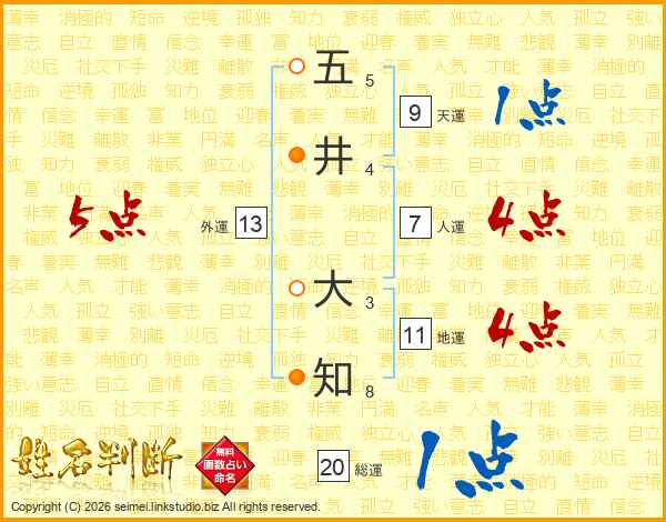 あなたの人生を表す1番重要な運勢です。生涯を通じて影響する総合運となり、主に50歳以降の晩年期に影響を及ぼします。苗字と名前の合計画数。