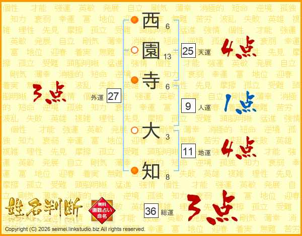 西(6画)園(13画)寺(6画) 大(3画)知(8画)