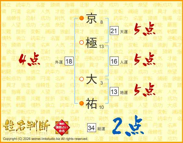 あなたの人生を表す1番重要な運勢です。生涯を通じて影響する総合運となり、主に50歳以降の晩年期に影響を及ぼします。苗字と名前の合計画数。