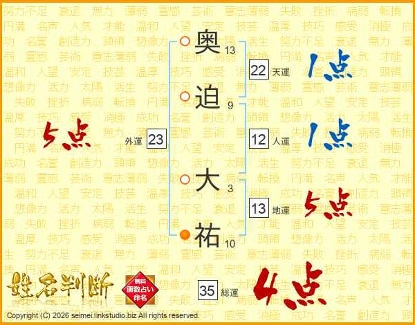 奥(13画)迫(9画) 大(3画)祐(10画)