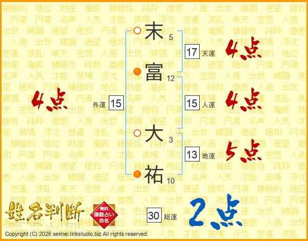 生活面を象徴する運勢です。外部から受ける影響力を表し、結婚運、家庭運や職場、環境への順応性を表します。総運から人運を引いた画数。姓や名が1文字の場合を除く。
