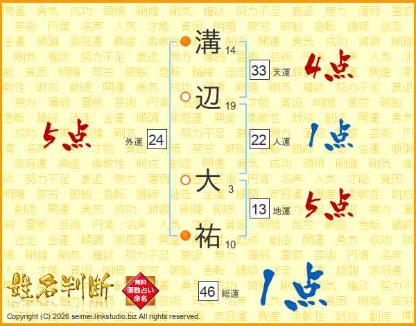 溝(14画)辺(19画) 大(3画)祐(10画)