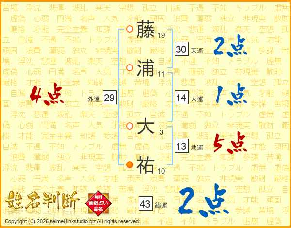 藤(19画)浦(11画) 大(3画)祐(10画)