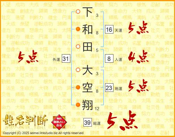 下(3画)和(8画)田(5画) 大(3画)空(8画)翔(12画)