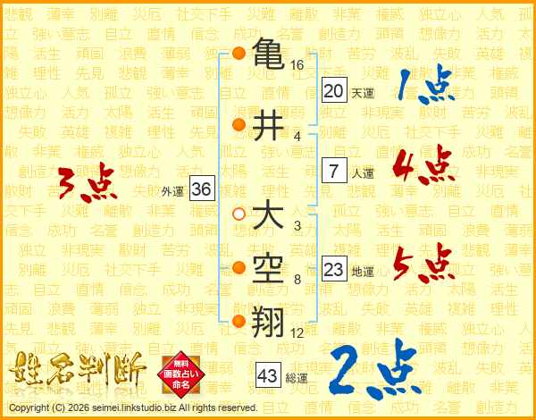 亀(16画)井(4画) 大(3画)空(8画)翔(12画)