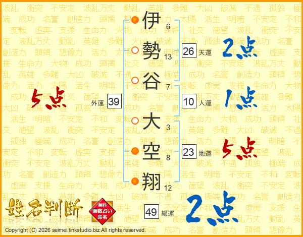 伊(6画)勢(13画)谷(7画) 大(3画)空(8画)翔(12画)