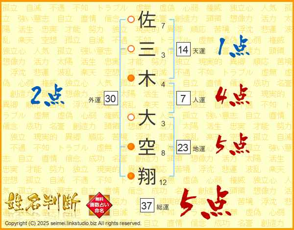 佐(7画)三(3画)木(4画) 大(3画)空(8画)翔(12画)