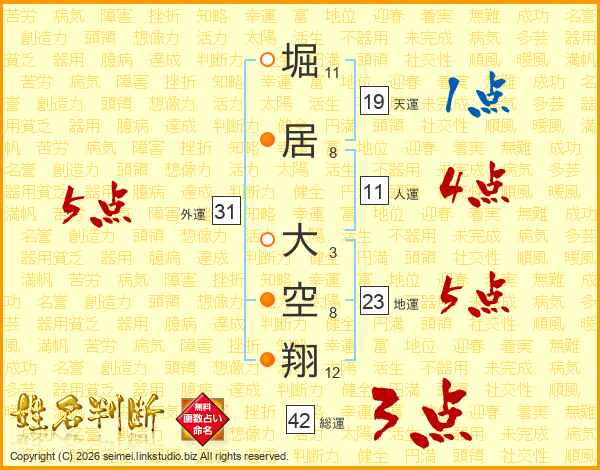 堀(11画)居(8画) 大(3画)空(8画)翔(12画)