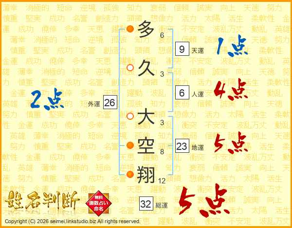 多(6画)久(3画) 大(3画)空(8画)翔(12画)