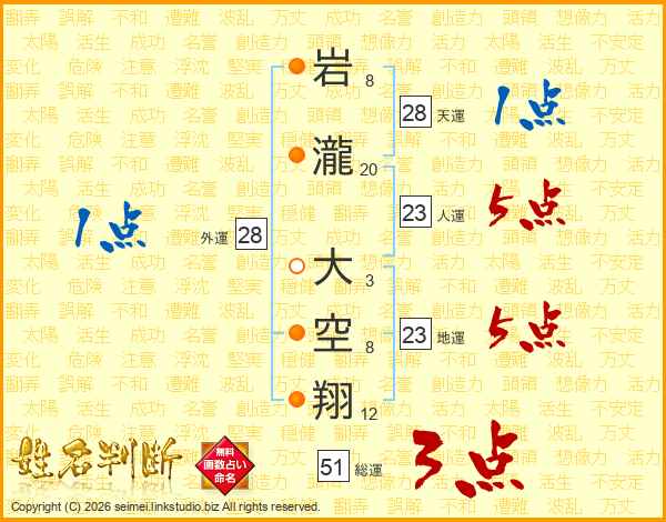 岩(8画)瀧(20画) 大(3画)空(8画)翔(12画)